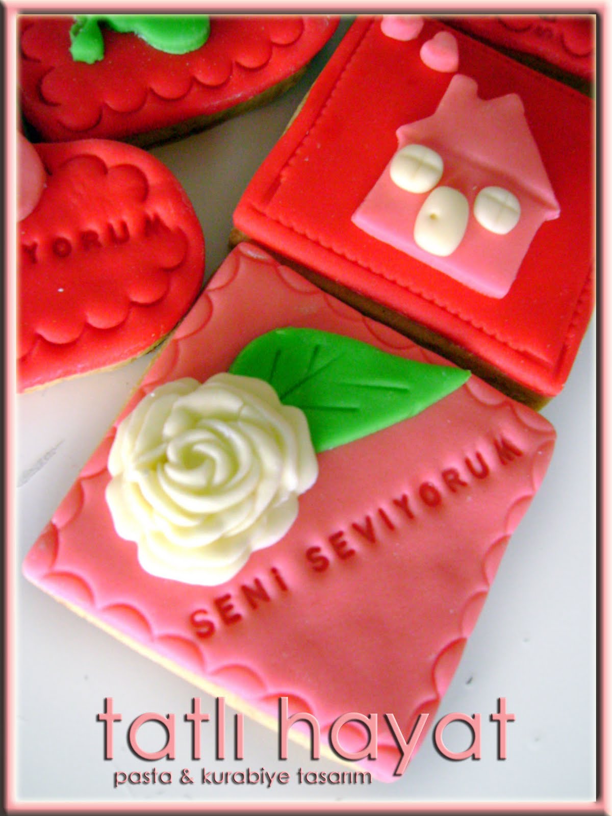 Bayram öncesi son hazırladığım 2 siparişimden birisiydi Aslı'nın erkek arkadaşı için istediği aşk kurabiye seti. Siparişi aldığım gün teslim ettim kurabiyelerimizi. Aslı tamamen bana bıraktı tasarımını ve bende aşk kurabiyelerinde genel olarak kullandığım temaları kullanmaya çalıştım. Kırmızı kalpli kutu içinde kuryeyle Karşıyaka'ya gönderildi kurabiyelerimiz.